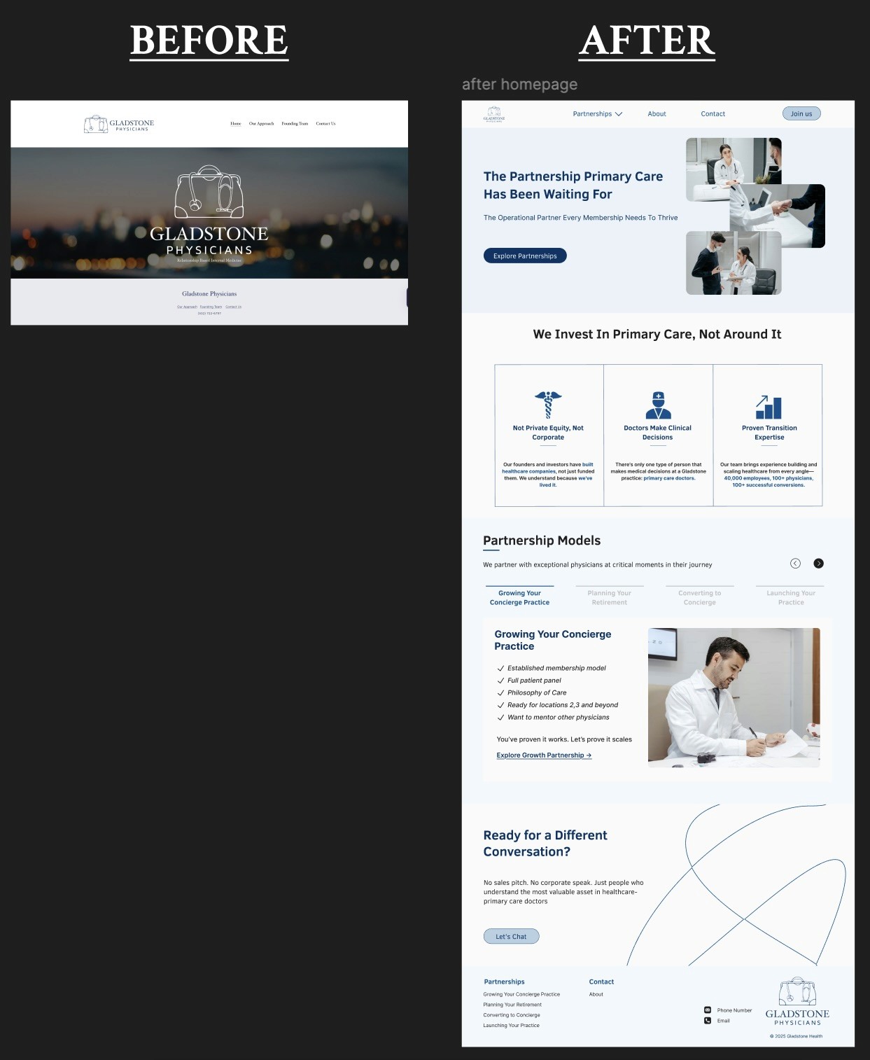 Physicians landing on Gladstone’s website were confused about what the company actually did and how it was different from private equity or corporate healthcare. Because of that, it was hard to trust the model or know what step to take next.