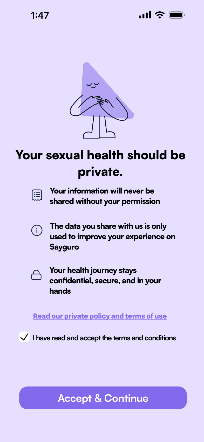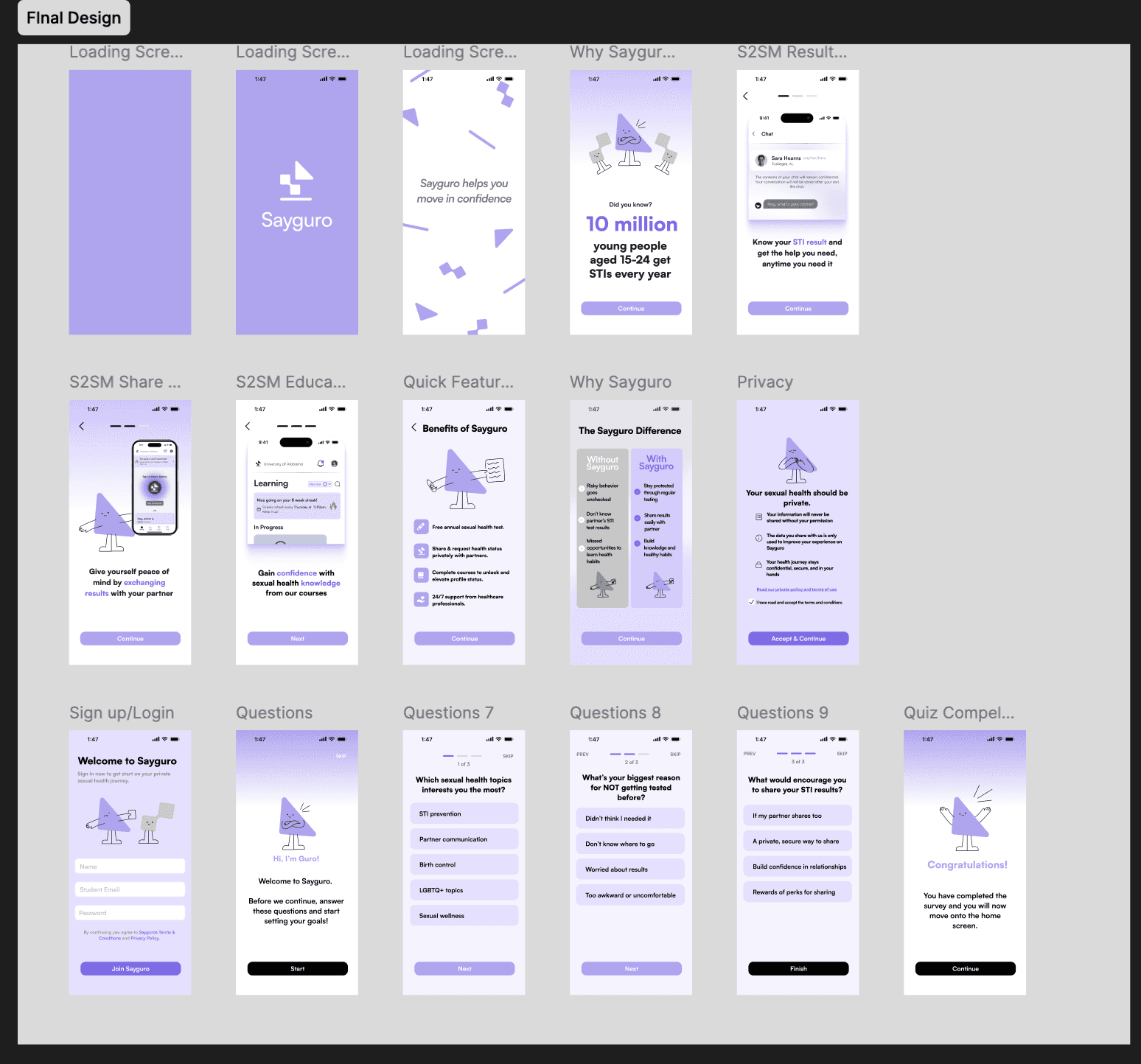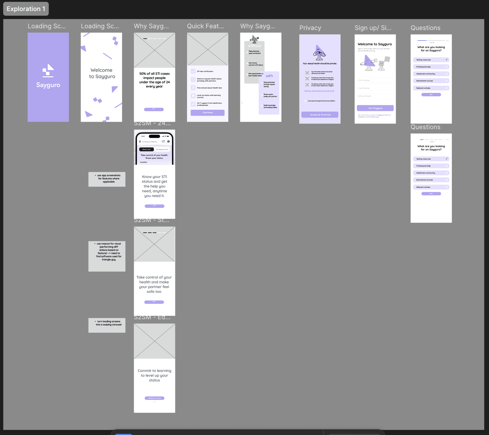 Redesigned Sayguro’s onboarding experience to make sexual health education more approachable and intuitive for college students. The goal was to reduce first-time friction, clearly communicate the app’s value, and create a smoother entry point into sensitive health topics.