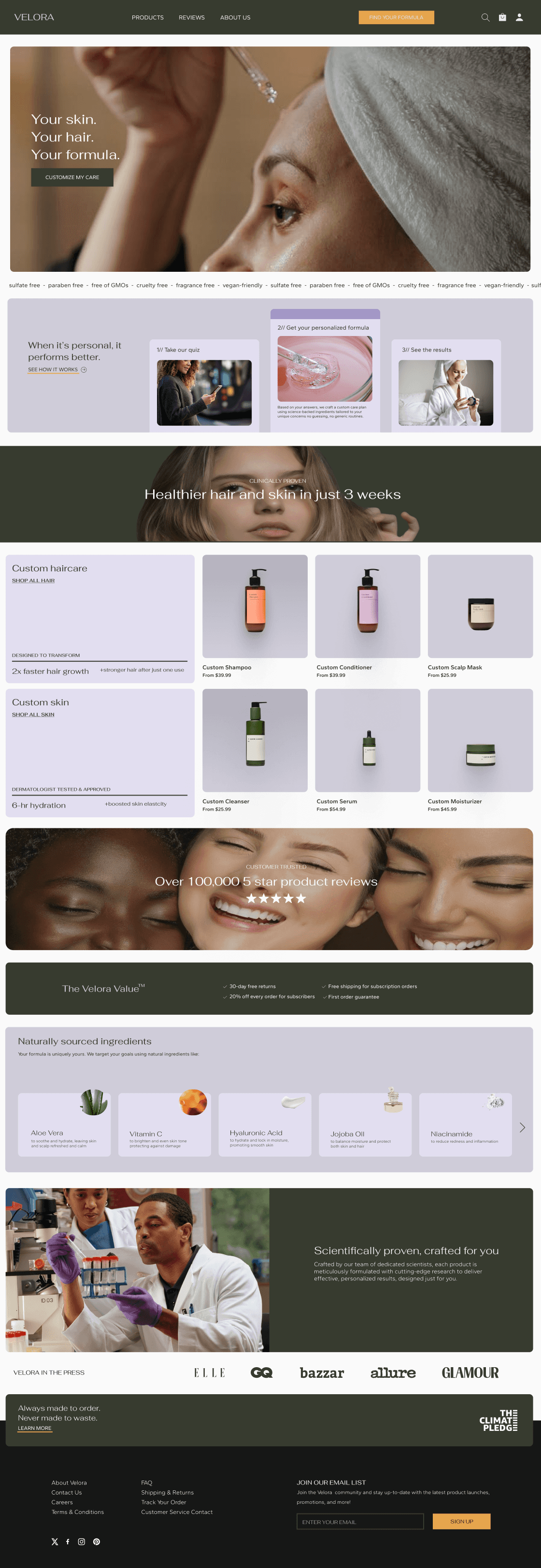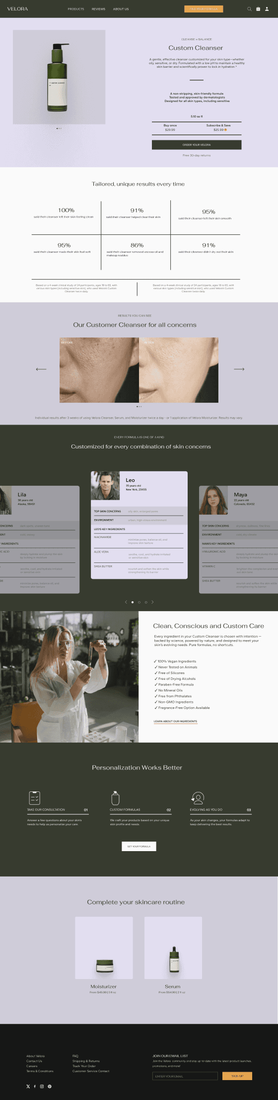 Velora is a skincare and haircare brand built around personalized routines. I designed a conversion-focused website that builds trust, simplifies product education, and helps users find the right routine without feeling overwhelmed.