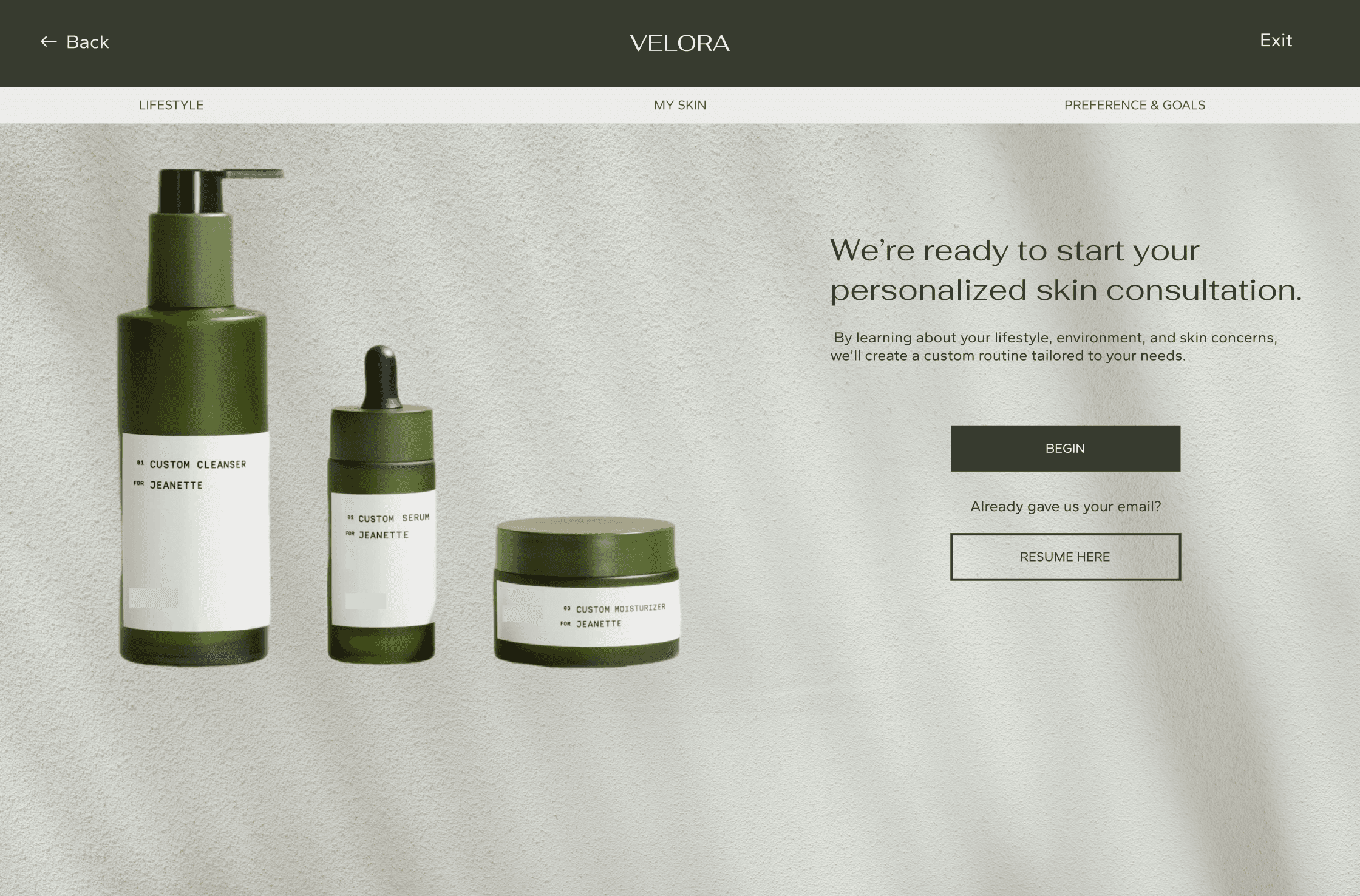 Most beauty sites throw products at you immediately. I wanted Velora to ask questions first. The quiz slows things down in a good way — it makes users feel like the brand actually cares what works for them.